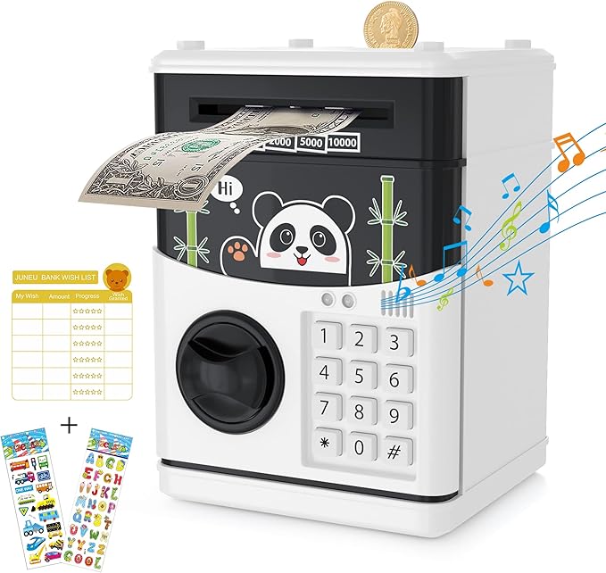 Esta alcancía cuenta con una ranura para monedas y un detector de billetes, además de una pantalla electrónica que muestra el saldo acumulado. La cerradura de seguridad mantiene los ahorros protegidos, asegurando que solo tú y tus hijos puedan acceder a ellos.